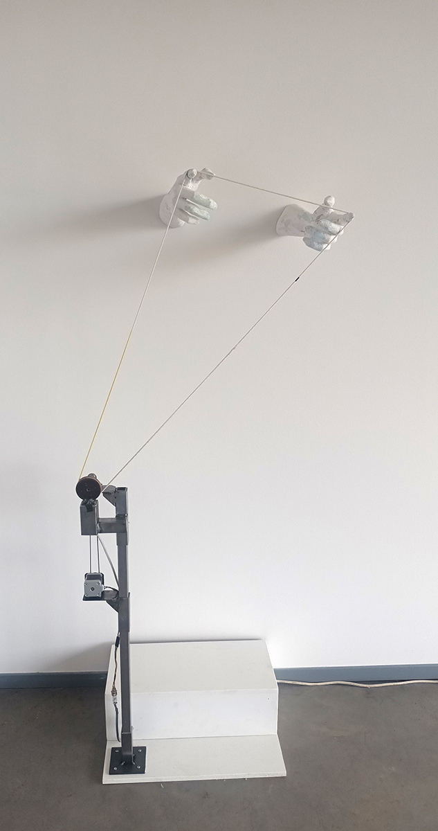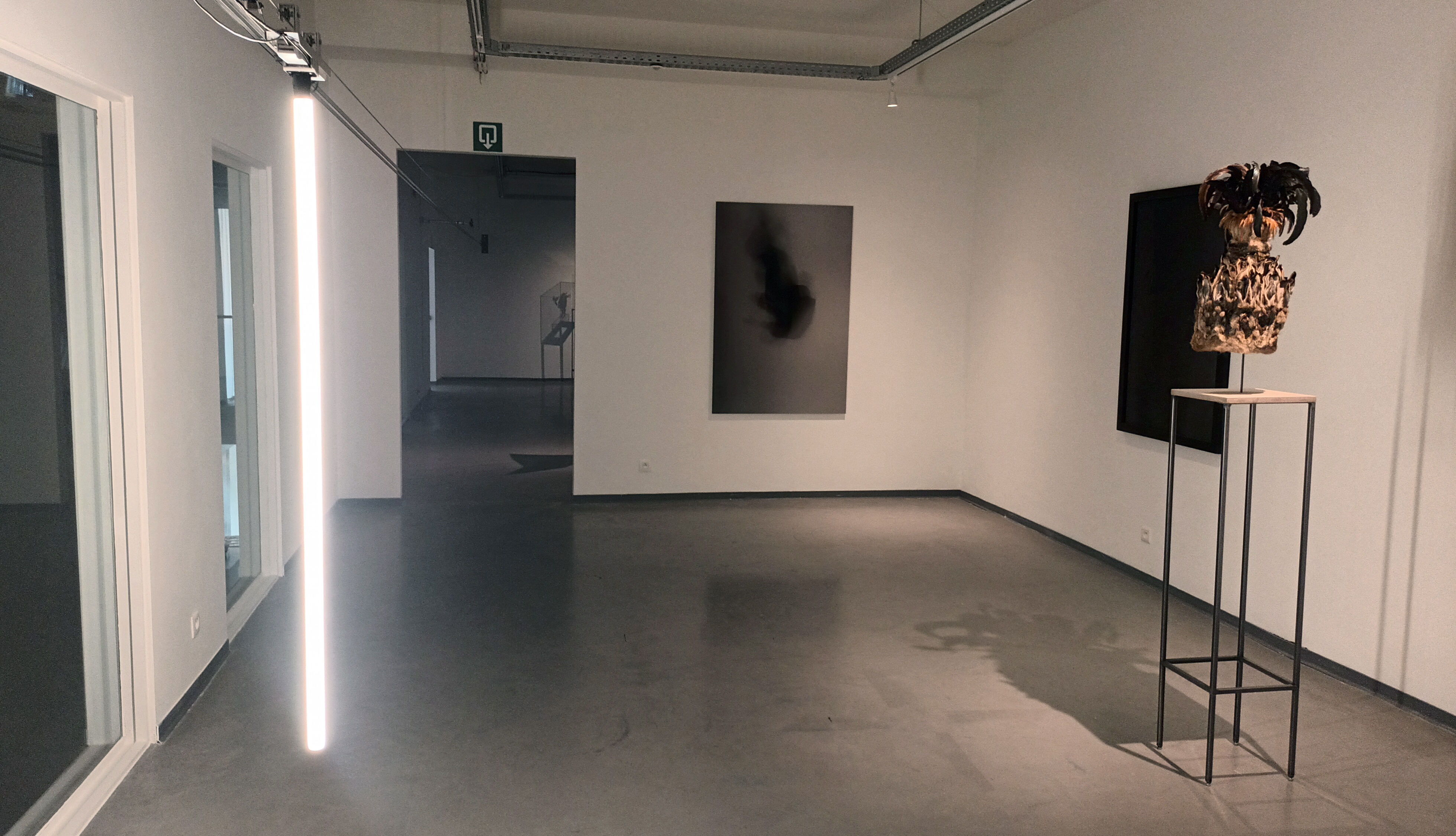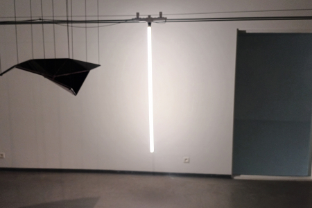 Je beweegt door (licht-) installaties, sculpturen, foto’s en video’s. Ze bevinden zich op grensgebieden tussen mens, dier en ding, werkelijkheid en fictie, poëzie en absurditeit. Sommige werken vragen om stilstand en aandacht, andere zetten je letterlijk in beweging. Alle werken hebben op hun eigen manier een link met theater of performance. Wat ze verbindt, is hun positie in het interstitium — de kier tussen twee toestanden. Ze zijn niet gevat in een helder voor of na, maar bewegen zich in het er tussen.